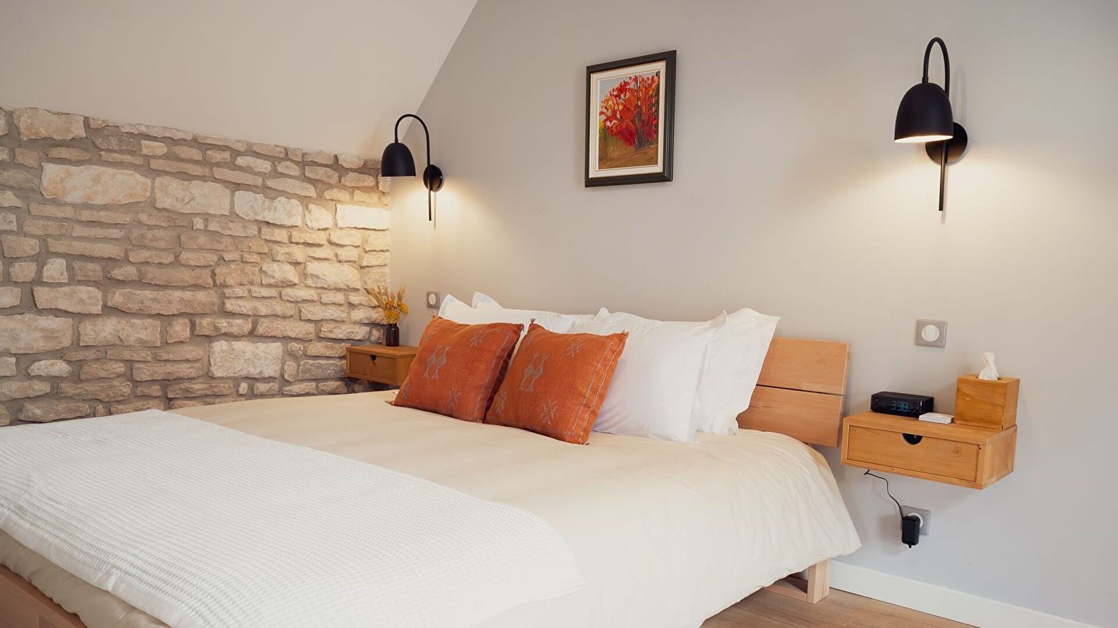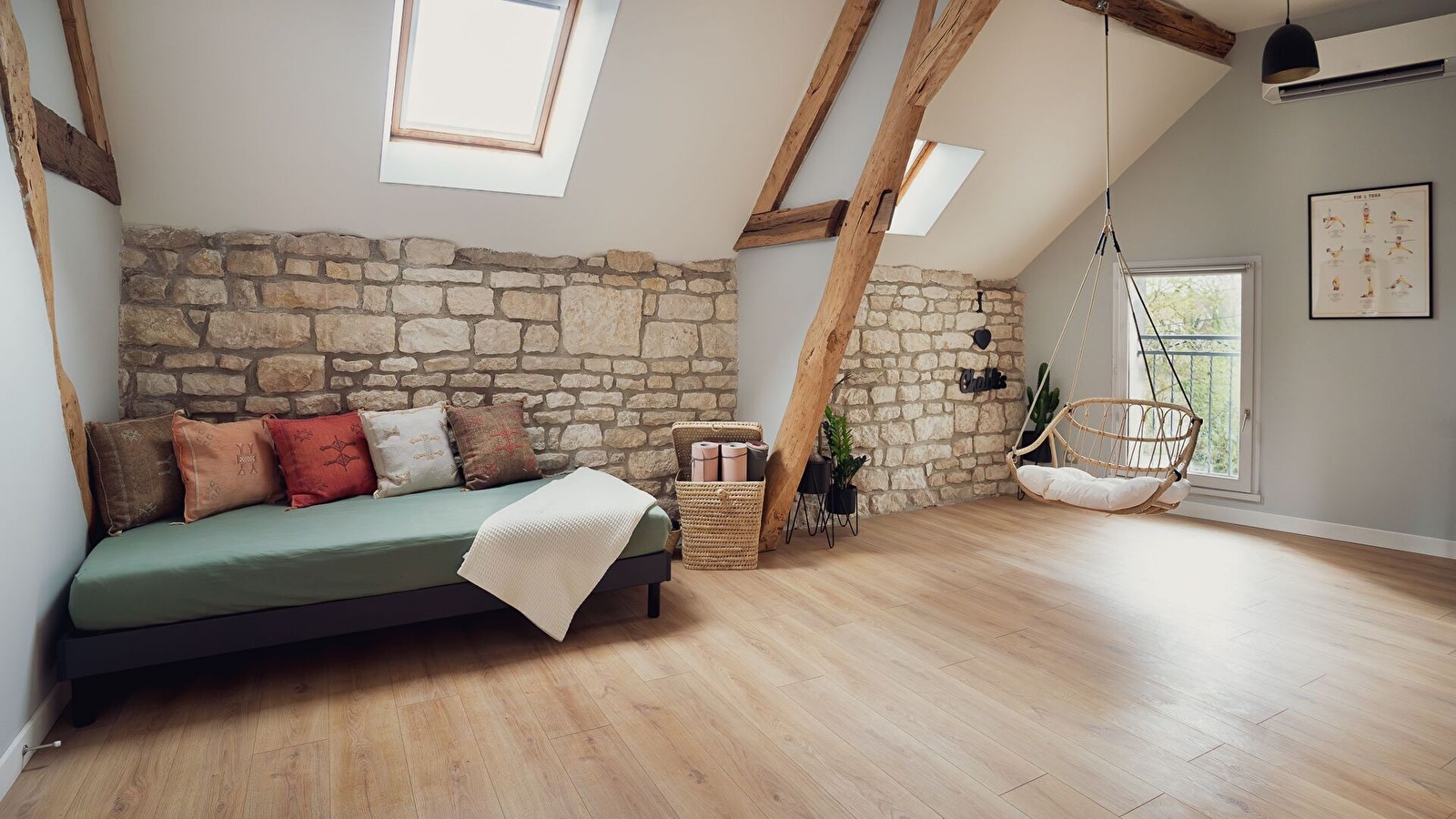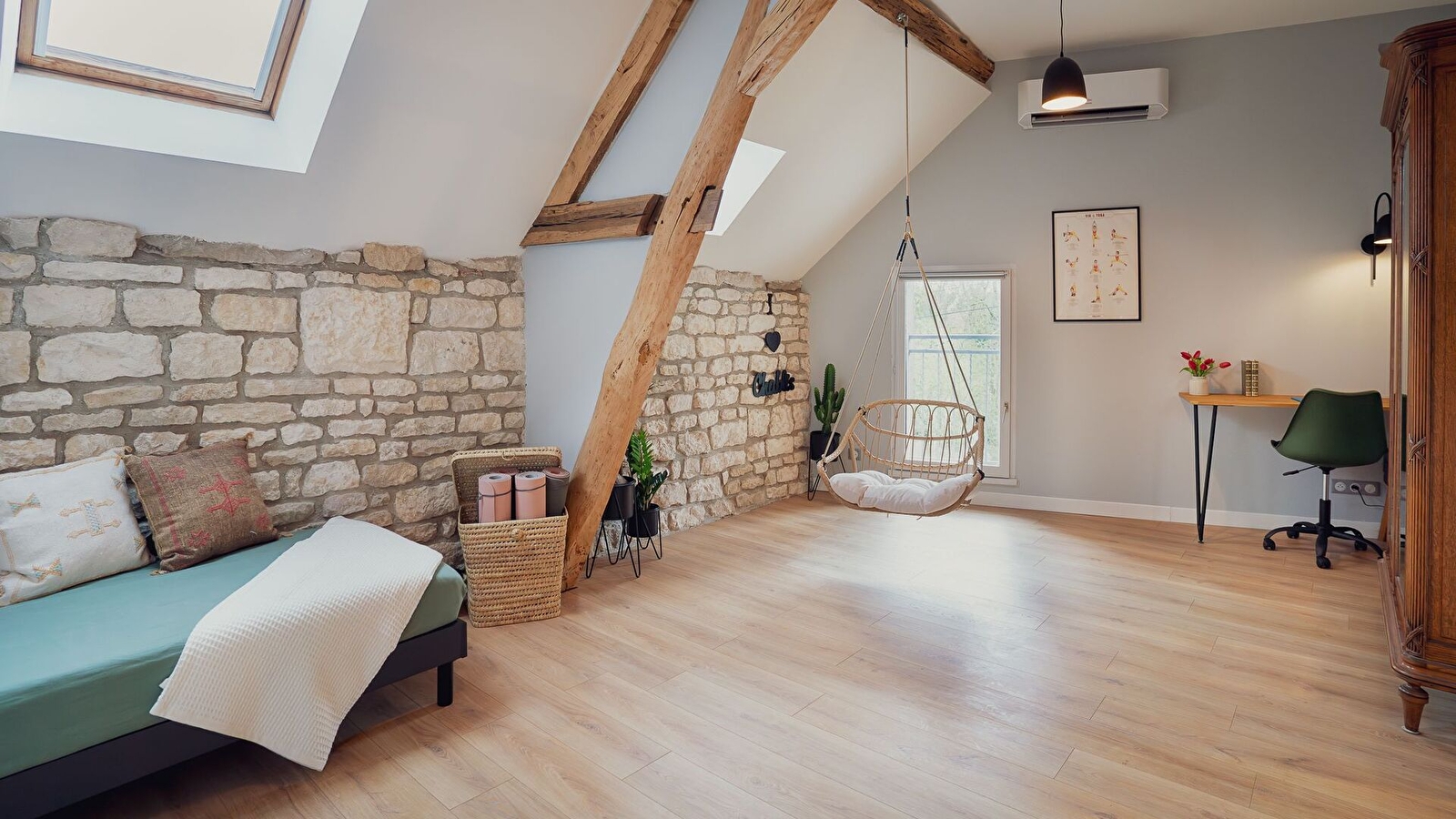 À l'étage : sur le palier, un lit simple (90x200), quelques tapis de yoga, un espace dédié au télétravail avec une jolie vue sur le Serein, une seconde salle d’eau avec douche et WC, ainsi qu’une chambre avec un grand lit double (180x200).