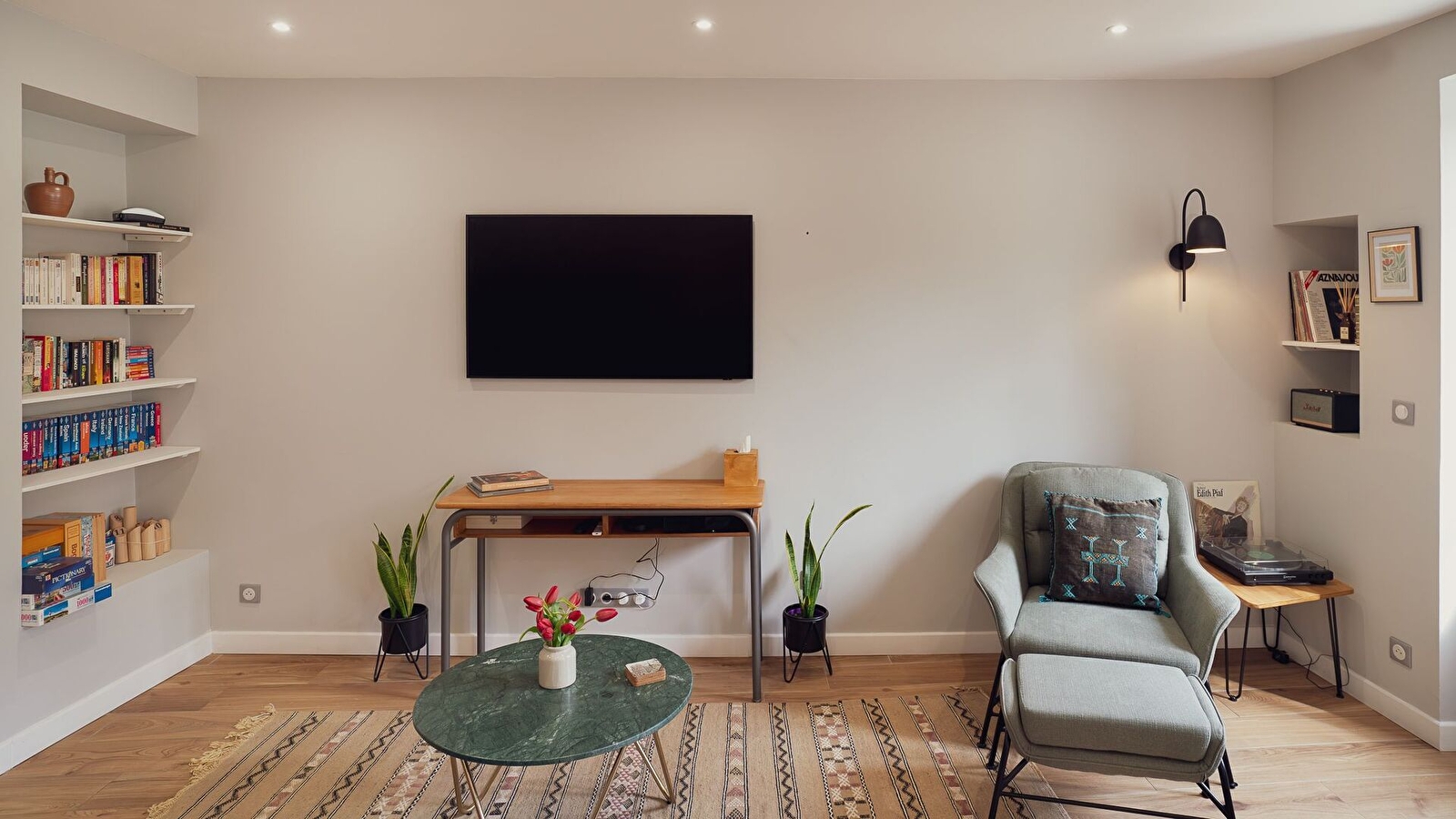 À l’extérieur : petite terrasse aménagée avec salon de jardin, plancha et bain nordique pour des moments de détente en toute saison.