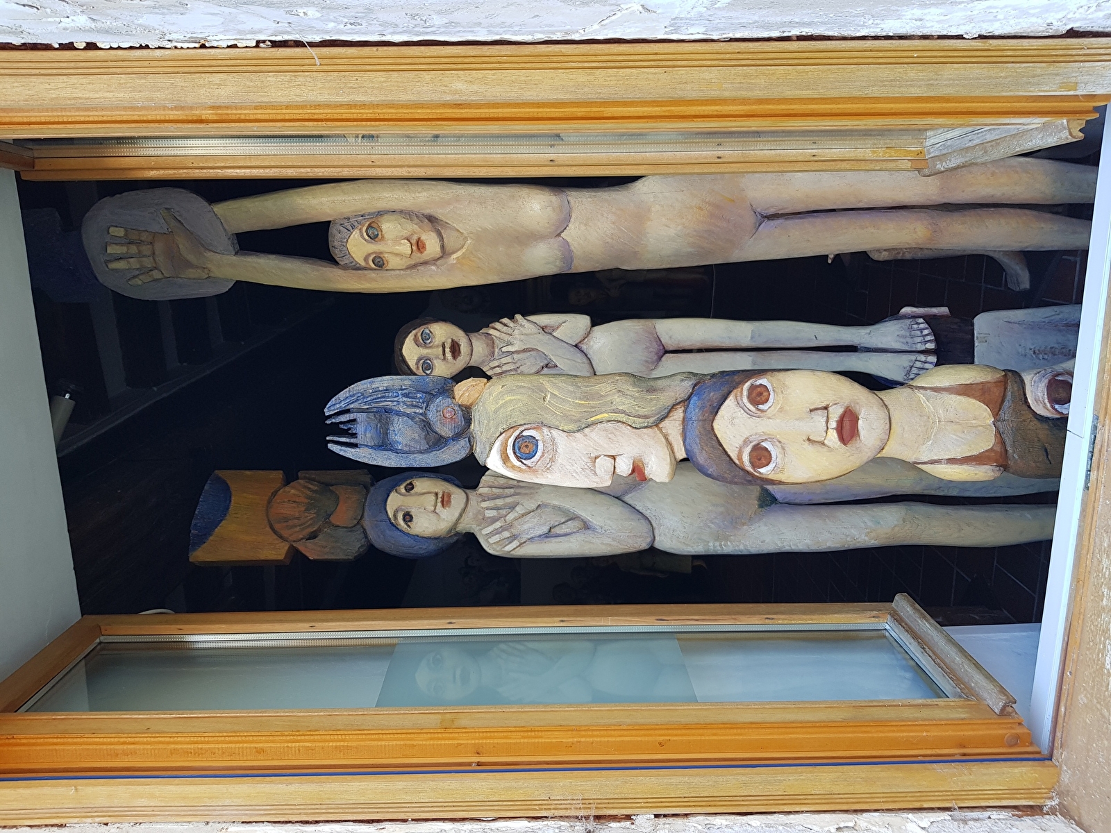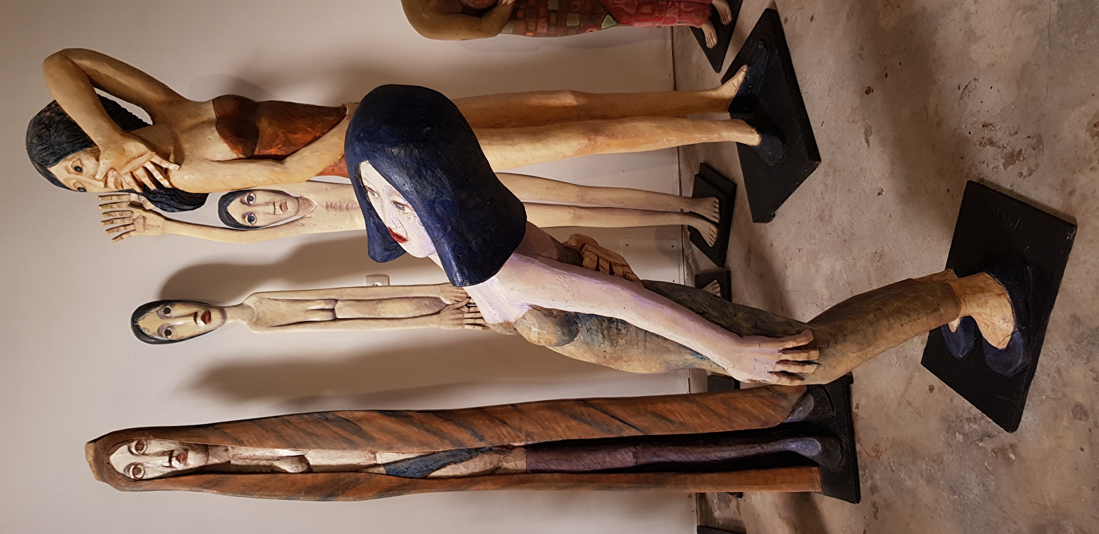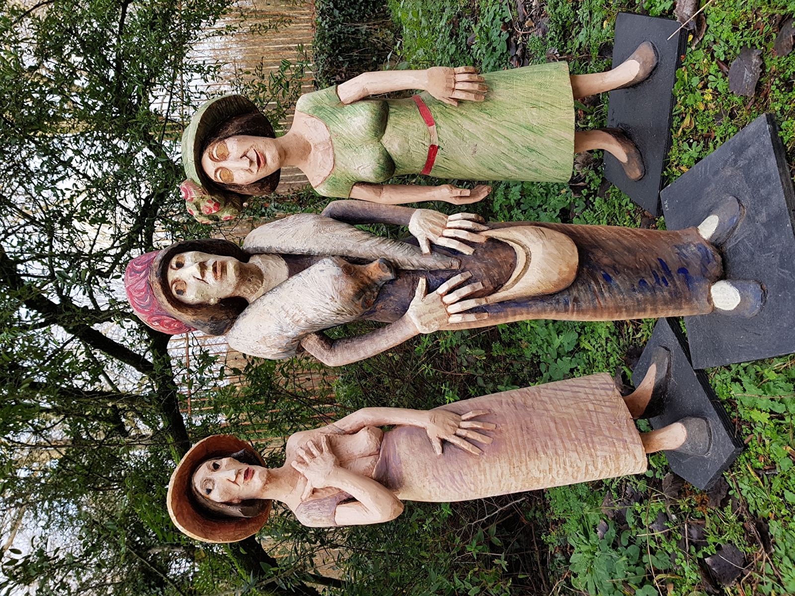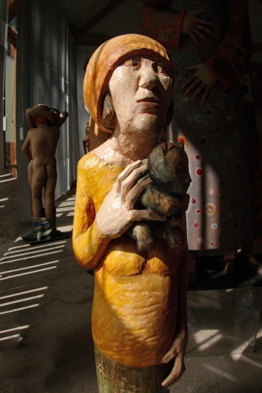 Mise en scène théâtrale de plus de 300 sculptures bois. "Chêne, tilleul, orme, cerisier, essence exotique, les figures émergent ironiques comme la famille des "banquiers" parmi lesquels on note quelques femmes mais aussi oniriques, chimériques , comme les orantes, des femmes drapées dans des voiles . Chaque fois , il s'agit de respecter ce que l'arbre offre, jouer avec la forme, l'inventer avec dérision et poésie. Les souches et leurs racines deviennent têtes, elles s'élancent vers le ciel, tandis que le corps pris dans le tronc de l'arbre semble s'ancrer délicatement dans le sol, pieds longs, aussi longs que les mains sont fines et les cous sont allongés, têtes posées là -dessus, visages dans un jeu de vérité "