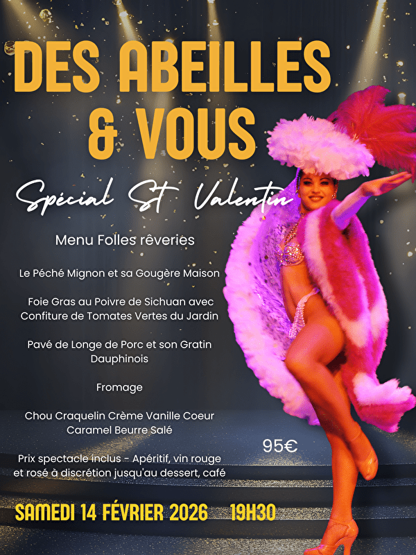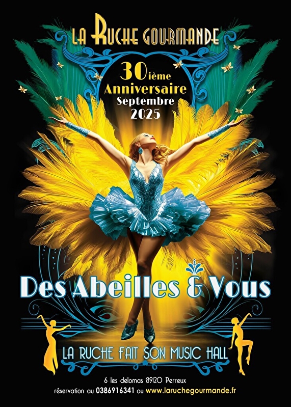 "Des Abeilles & Vous", La Ruche fait son music hall, Notre nouveau spectacle vous invite à un tourbillon de chansons, de rires et d’émotions, entièrement chanté en live. Laissez-vous emporter par une ruche en pleine effervescence, où l’amour, l’humour et l’extravagance sont les reines de la fête ! Depuis plus de 30 ans, vous êtes de plus en plus nombreux à venir butiner nos spectacles.