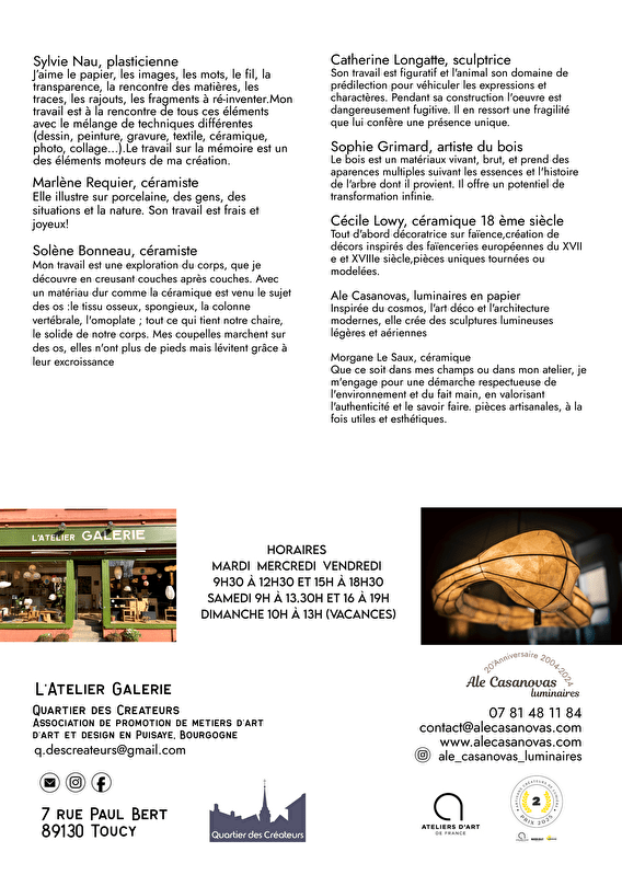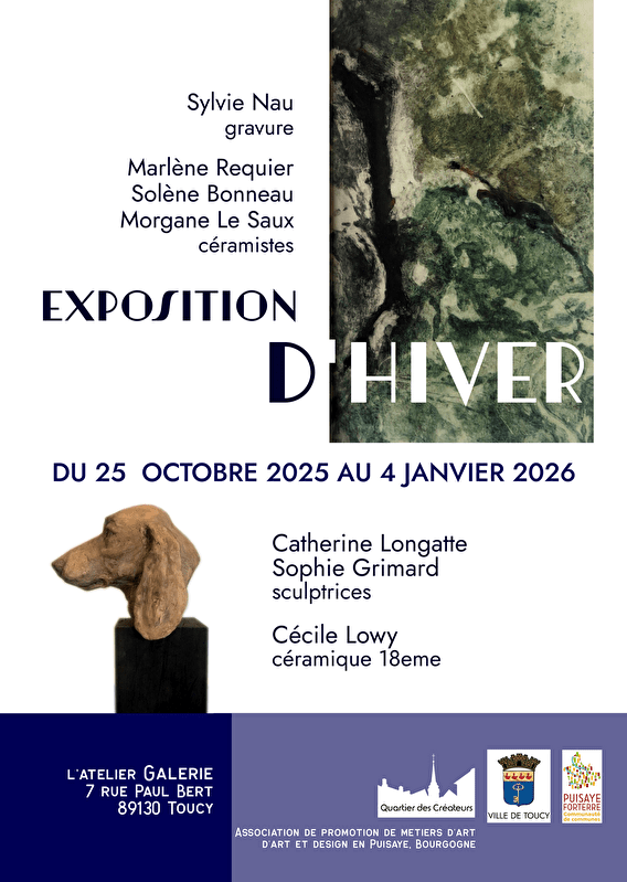 Cet hiver huit femmes artistes artisanes exposent ses oeuvres à l'atelier Galerie à Toucy. Pour cette fin d'année et vos présents de Noël, L'atelier Galerie vous propose les objets de huit créatrices, gravure, céramiques traditionnelles et contemporaines, sculptures animalières et bois tourné. Comme chaque hiver nous vous enchanterons avec une sélection d'artistes talentueuses et une galerie que brille dans la nuit!