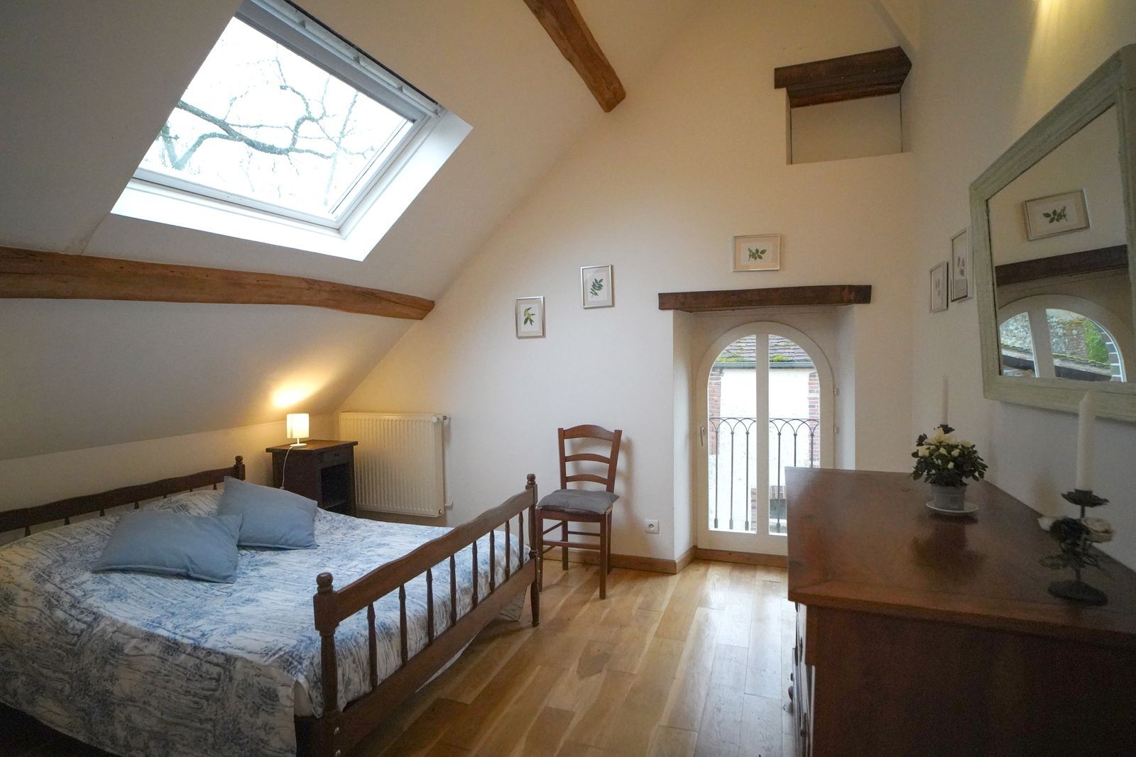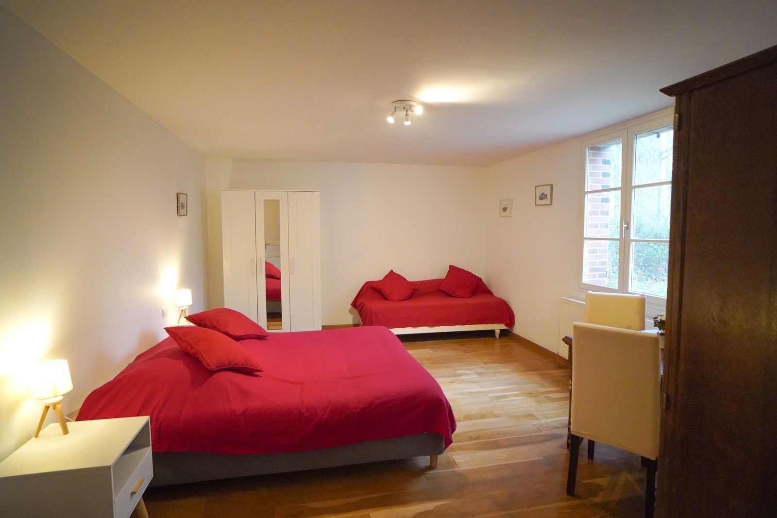 La Maison, tout confort de 145 m², rénovée avec de nobles matériaux (carrelage, parquets et escalier bois massif, poutres apparentes, cheminée,…) : 4 chambres, 1 grande pièce de vie, TV et Internet, 2 SdB, 2 WC, est située au bout d’une grande allée et au milieu d’un jardin paysager clos de 1.400 m2 entouré de bois et de champs ; peut recevoir de 4 à 9 personnes.