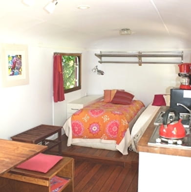 Installée au bord de la rivière, la roulotte du Serein, authentique roulotte de cirque des années 1960, bénéficie d'une vue magnifique dans un cadre naturel, paisible et préservé, à côté d'un pigeonnier du XVIIe siècle.