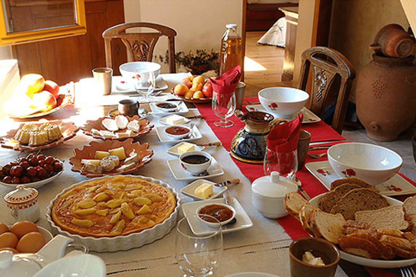l’ombre de vieux pruniers. Copieux petit-déjeuner salé-sucré et agrémenté de produits Bio fermiers selon la saison.