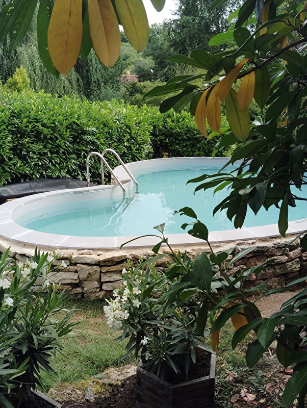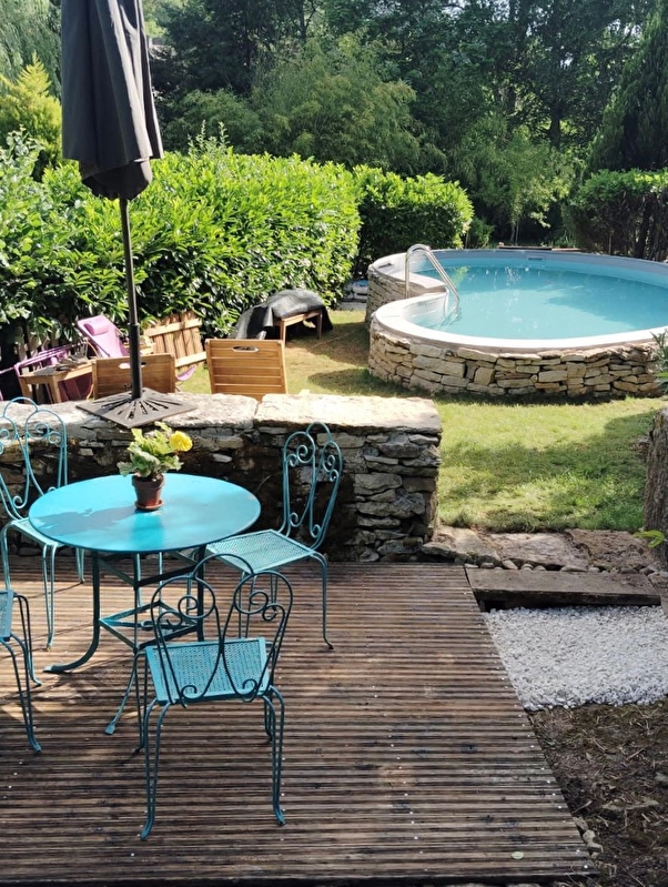 2 accès vers l'étage, de la cuisine ou du salon, menant aux 2 chambres (3 lits double de 140x190) et à la salle d'eau avec WC . Un espace extérieur attenant est à disposition avec table , chaises et barbecue. Le jardin, partagé avec les propriétaires est ouvert aux locataires, des tables, chaises, et fauteuils sont disséminés en différents endroits pour profiter de la verdure et de l'eau. Une aire de jeux avec balançoires attend les enfants…Nous mettons à disposition l’été un espace aménagé avec piscine semi enterrée, table et chaises, salon de jardin, transats… L’usage de la piscine est réglementé, au niveau des horaires d’ouverture, de 15h à 19 h, et de son accès quand il y a des enfants, les consignes sont écrites sur place.