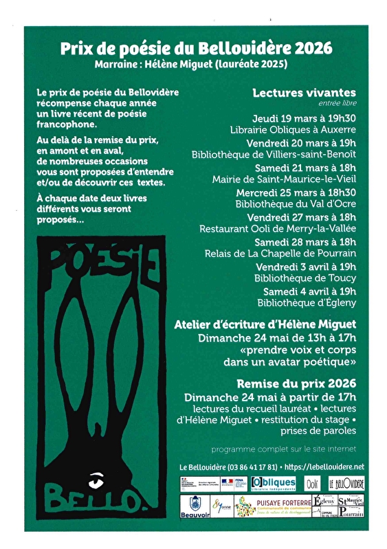 En effet, au delà de la remise du prix, en amont et en aval de celui-ci, de nombreuses occasions d’entendre et/ou de découvrir la poésie seront proposées sur le territoire par les bénévoles du Bellovidère.