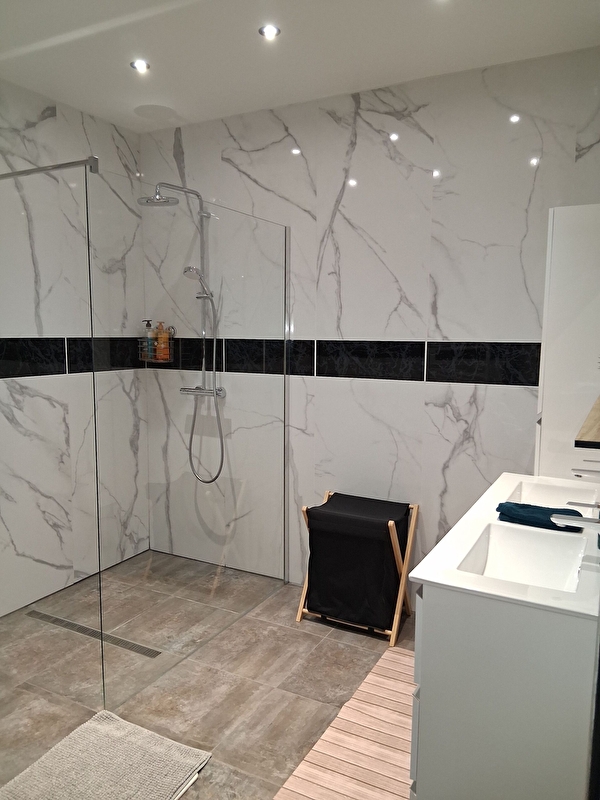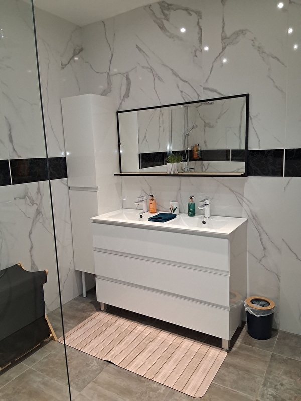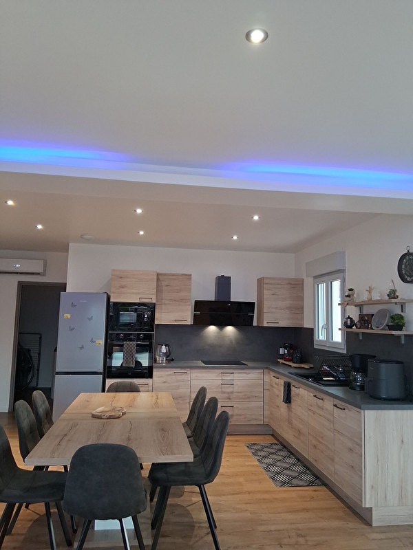 Entrée : cuisine équipée ouvert sur pièce à vivre avec smart TV, Hi-Fi, baby-foot, jeux de société; 3 chambres dont 2 avec 1 lit 140x190 et 1 avec 1 lit 160x200; buanderie avec lave-linge; 1 salle d'eau avec douche grande dimension et double vasque, 1 WC indépendant .Équipement bébé à disposition : lit bébé, chaise haute, baignoire, rehausseur WC.