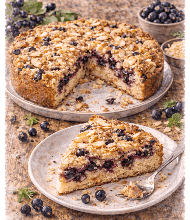 Généreux et délicatement fruité, le crumble cake cassis-amande associe la douceur d’un gâteau moelleux au caractère acidulé du cassis, emblématique des vergers bourguignons.