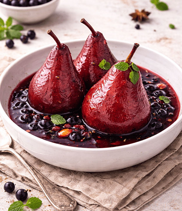 Délicates et parfumées, les poires au vin et cassis offrent une conclusion tout en élégance à un repas bourguignon.