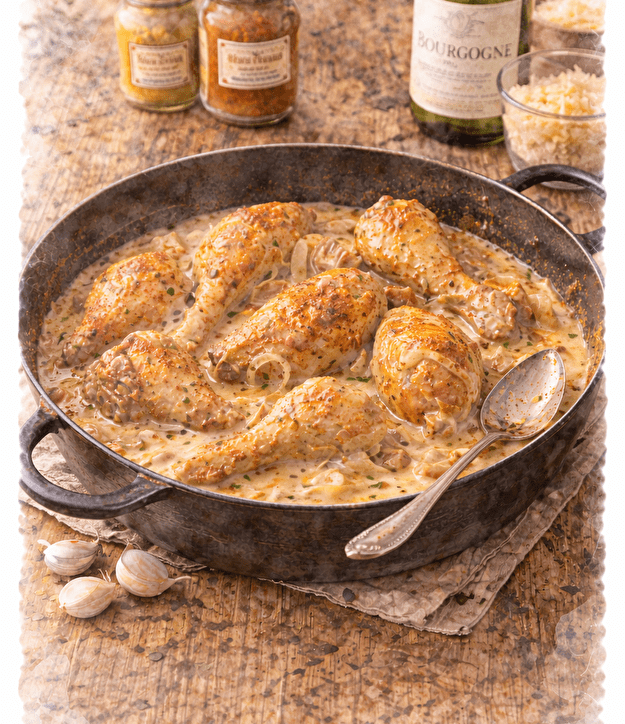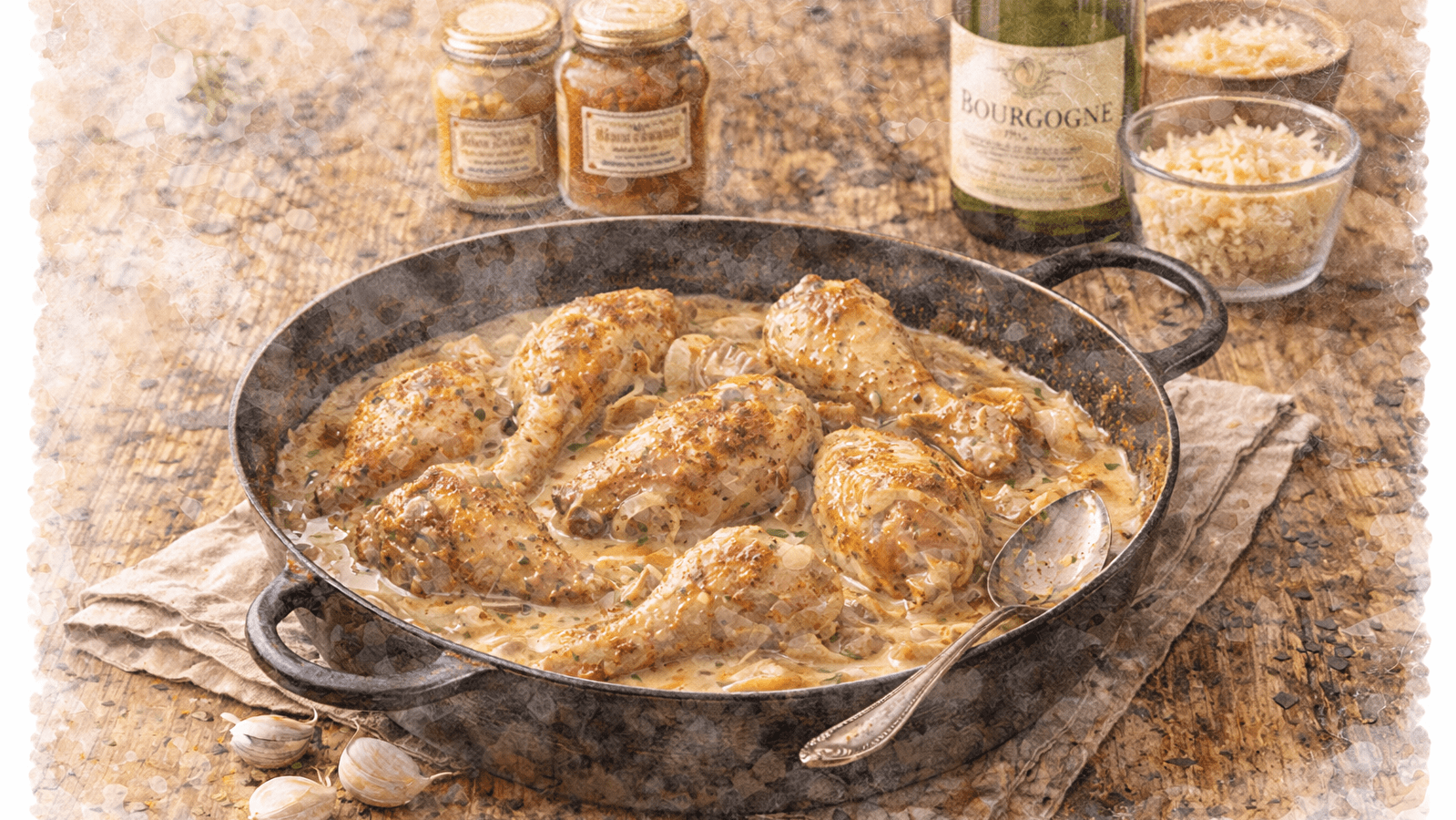Plat emblématique de la gastronomie bourguignonne, le poulet Gaston Gérard marie la générosité d’une volaille fondante à la puissance aromatique de la moutarde de Dijon et à l’onctuosité d’une sauce gratinée au fromage.